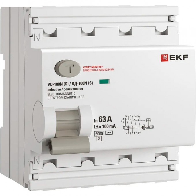 Выключатель дифференциального тока EKF ВД-100N (S) 4P 63А 100мА тип AC эл-мех 6кА PROXIMA E1046MS63100